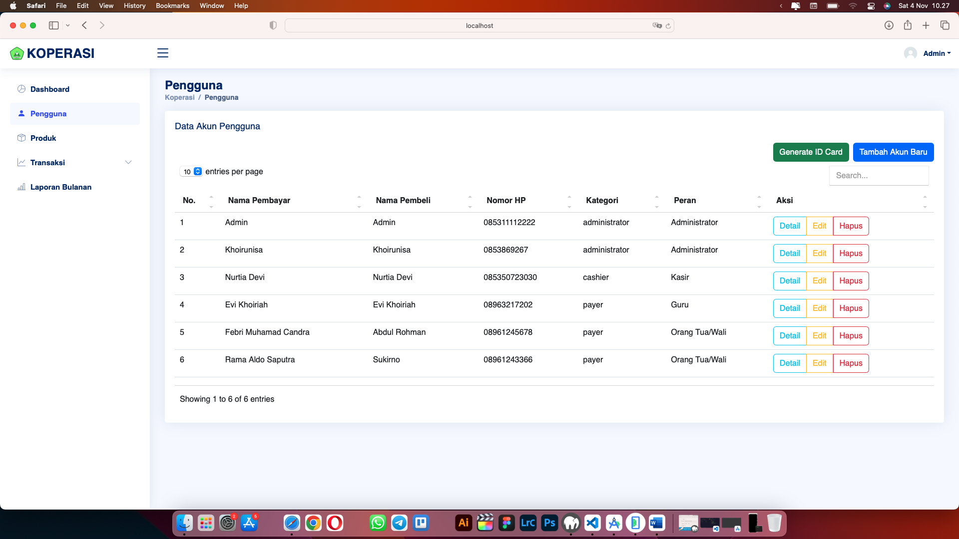 Saya mengembangkan aplikasi Koperasi MINDA sebagai solusi digital lengkap untuk mendukung pencatatan dan pengelolaan transaksi pembelian di lingkungan koperasi. Aplikasi ini terdiri dari Website Admin, Aplikasi Android, dan REST API yang saling terintegrasi. Melalui website admin, petugas koperasi dapat melakukan manajemen data pengguna dan produk (CRUD), mencetak kartu ID pembeli, memantau transaksi harian, serta mencetak laporan penjualan bulanan. Website ini dibangun menggunakan Node.js, MySQL, HTML, dan Tailwind CSS untuk antarmuka yang modern dan responsif.