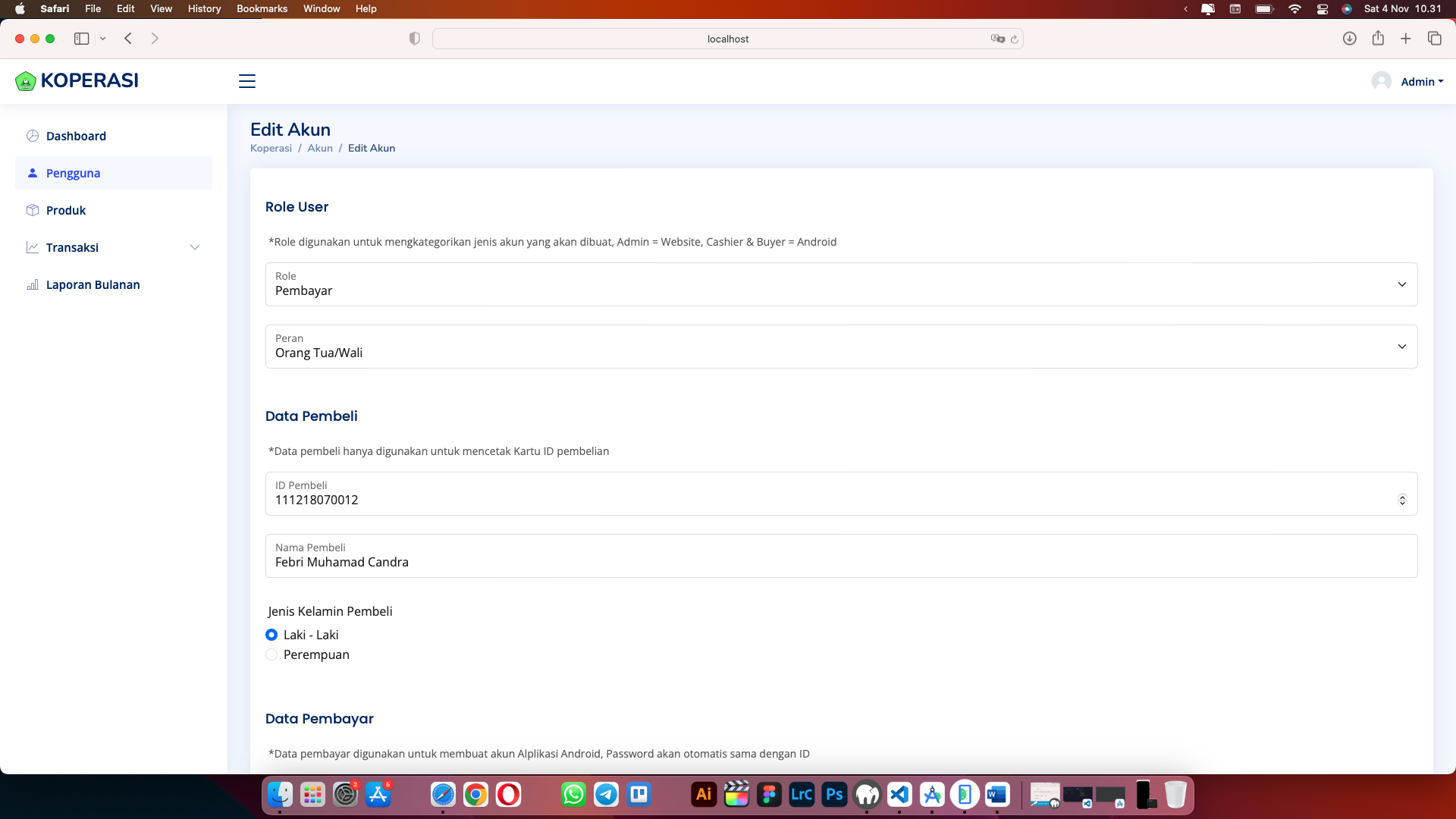 Sementara itu, aplikasi Android memiliki dua jenis peran pengguna, yaitu Kasir dan Pembayar. Kasir dapat melakukan scan barcode produk dan mencatat transaksi pembelian, sedangkan Pembayar dapat melihat riwayat transaksi serta tagihan yang harus dibayar. Seluruh sistem terhubung melalui REST API yang saya rancang sendiri untuk menangani autentikasi, pertukaran data, dan proses transaksi secara efisien. Proyek ini saya kembangkan secara penuh dari sisi frontend, backend, hingga API, sebagai bagian dari penyelesaian Skripsi dan juga sebagai bukti keahlian saya sebagai Full Stack Developer.
